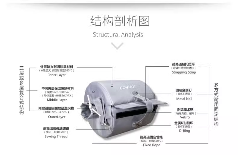 1、絕熱保溫效果好,隔熱層采用新型柔性耐熱纖維隔熱材料,耐溫范圍廣,最高能達到1000℃以上。